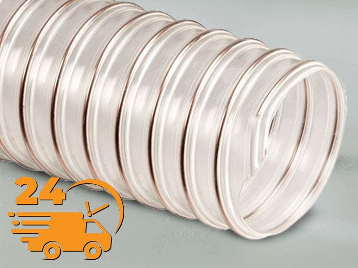 Flx-Thane® MD Polyurethane Dust Collection Hose is highly flexible, compressible, and puncture resistant to stand up to the toughest wood chips and sawdust. Clear for easy contents viewing, this robust polyurethane hose is reinforced with a bronze coated spring steel wire helix and is available in 2 to 12" (50.8 to 304.8 mm) I.D. sizes in 6 to 50 ft lengths for hose 4", 6", and 8" I.D.s. For 2" to 12" I.D.s, standard 25 ft lengths are available. You can customize your fit.