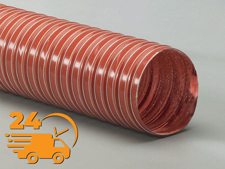 The Heat-Flex GS Hose is a double-ply, iron oxide red silicone coated fiberglass fabric that has been reinforced with a spring steel wire helix and external filament fiberglass cord. It is resistant to many oils and solvents, and is suited for high temperature air handling. It is available with an ID range from 1" to 12" and a length of 12' in order to get a custom fit for your application.