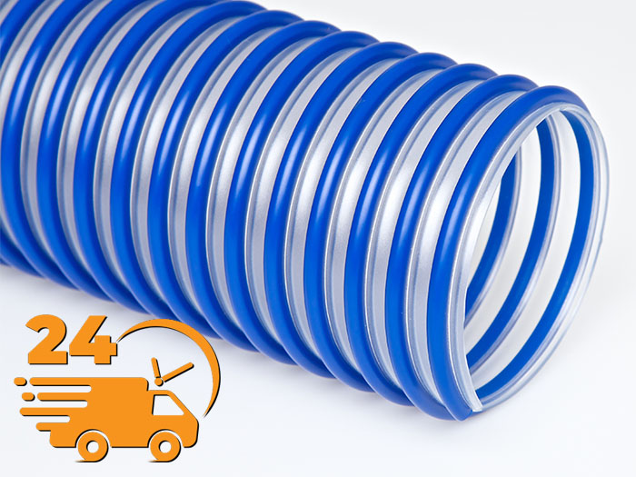 Highly flexible very heavy weight clear thermoplastic polyether polyurethane hose with a blue rigid external ABS helix.