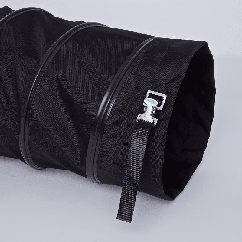 High strength sewn single-ply polyurethane coated black polyester fabric duct reinforced with a spring steel wire helix & black heavy-duty external PVC wearstrip.