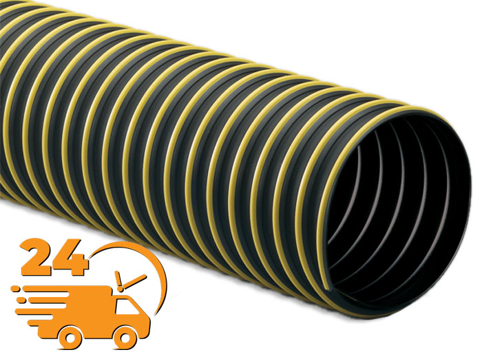 Heavy weight black thermoplastic rubber hose reinforced with a spring steel wire helix & yellow external polypropylene wear-strip